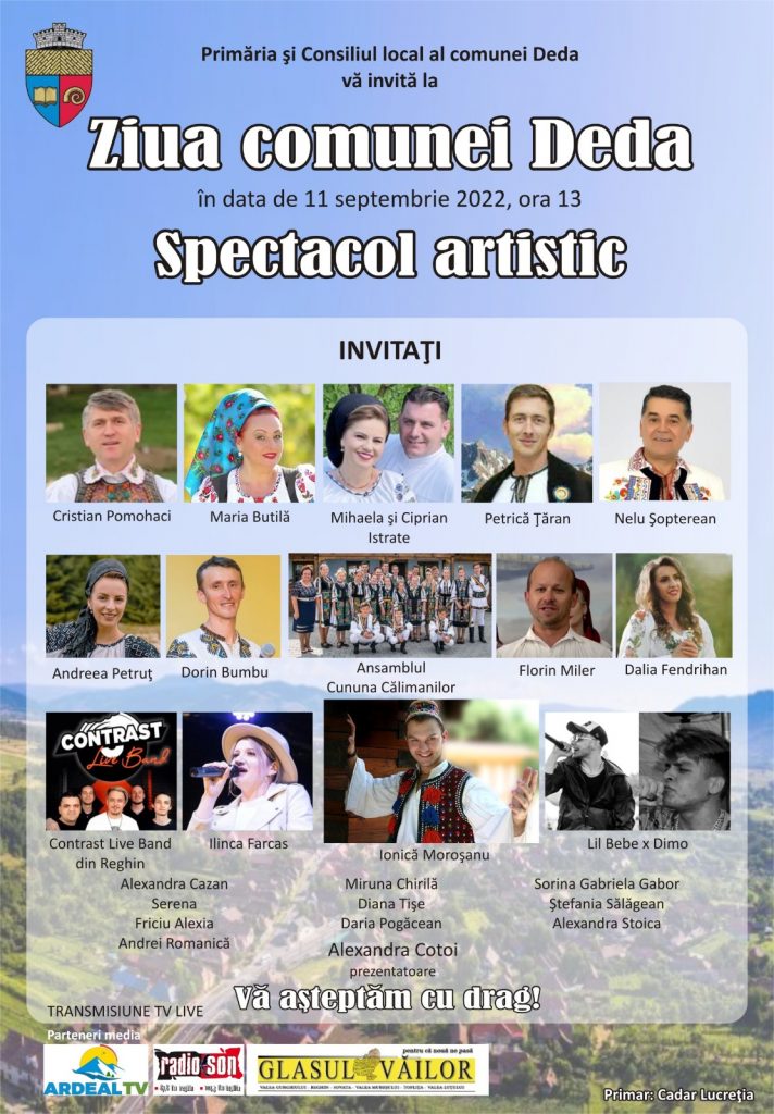 În cadrul Activităţii A7 Derularea campaniei de informare şi conştientizare în domeniul combaterii discriminării si actiunii de implicare activă si voluntariat ai membrilor comunităţii în solutionarea problemelor cu care se confruntă comunitatea, acţiuni de facilitare si mediere pentru identificarea si consolidarea de parteneriate pt rezolvarea problemelor comunitatii, SubActivitatea 7.2 Acţiuni de facilitare si mediere pentru identificarea şi consolidarea de parteneriate pentru rezolvarea problemelor comunităţii printr-o abordare participativă, vă invităm împreună cu toată echipa de implementare a proiectului, echipa de voluntari implicați în proiect, precum și partenerii din proiect, actori sociali și economici relevanți pentru identificarea de soluții adecvate, inovative, care să contribuie la rezolvarea principalelor probleme ale comunității, pentru asigurarea sustenabilității serviciilor inițiate prin proiect și dezvoltarea comunității, la ziua comunei Deda. |