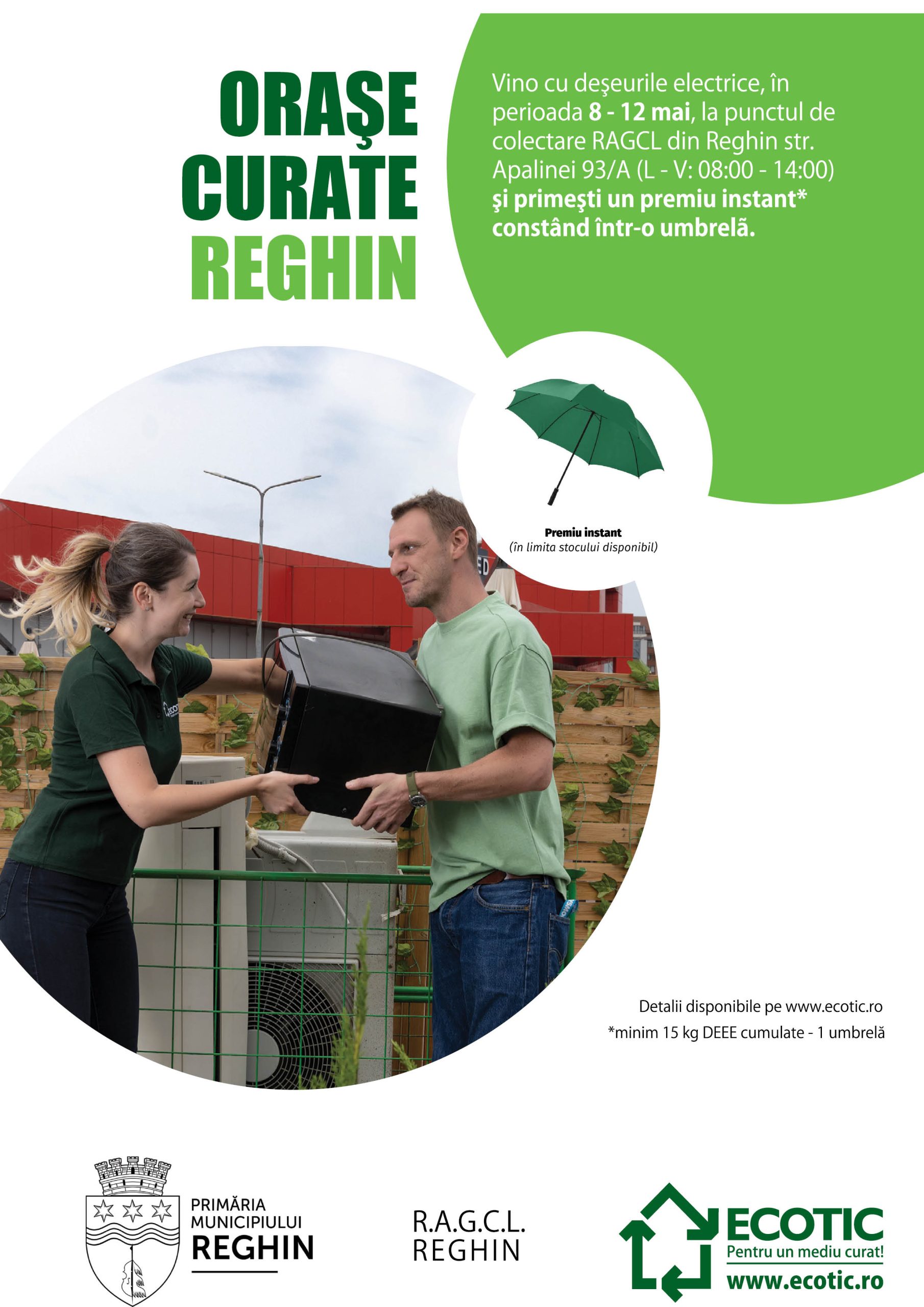 În perioada 8 – 12 mai 2023, ECOTIC în parteneriat cu Primăria Municipiului Reghin și operatorul de salubritate SC RAGCL SA, încurajează cetățenii să predea corect spre reciclare deșeurile de echipamente electrice și electronice (DEEE), urmând ca pentru predarea a minim 15 kg DEEE cumulate să primească un premiu instant constând într-o umbrelă.