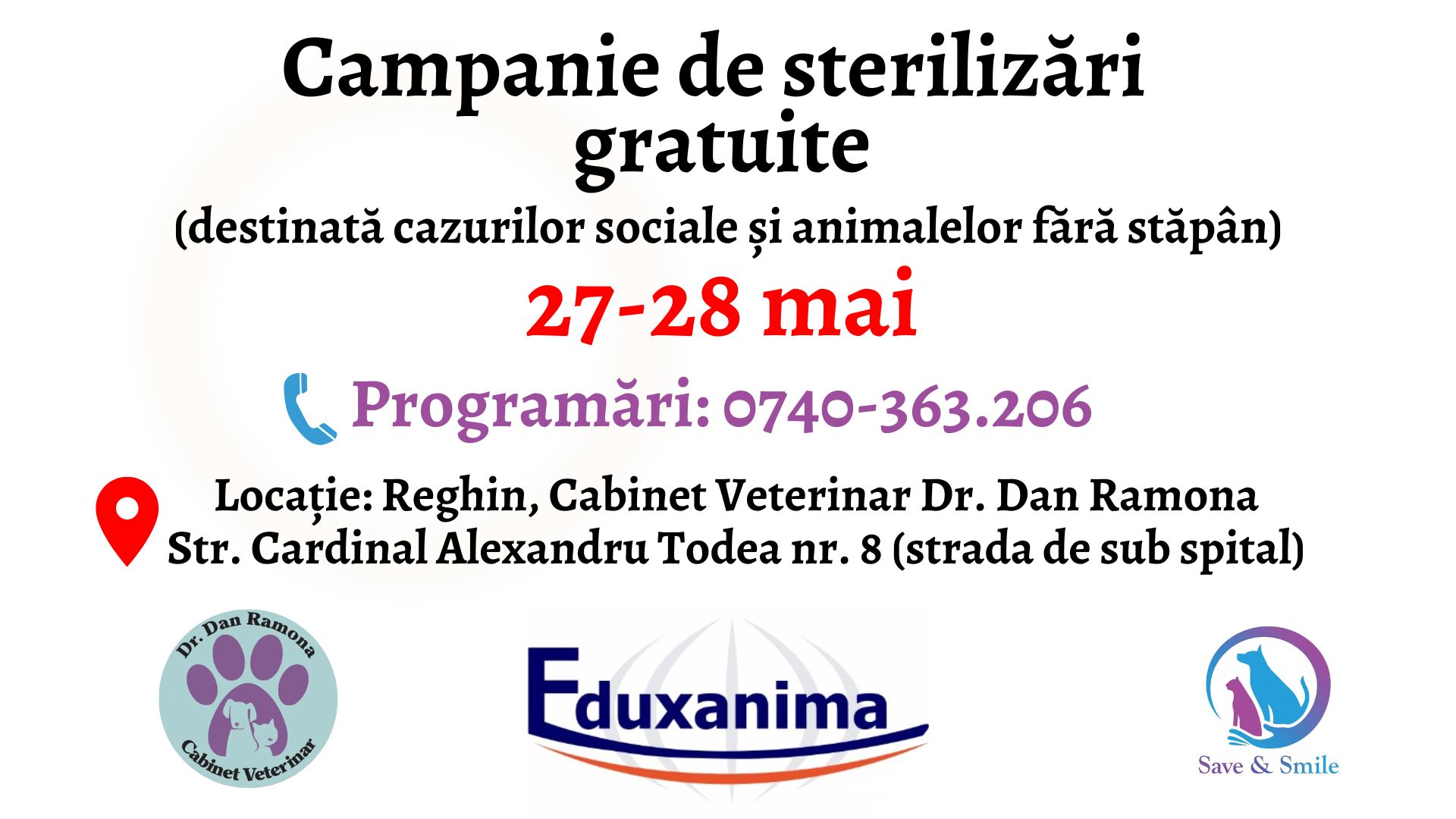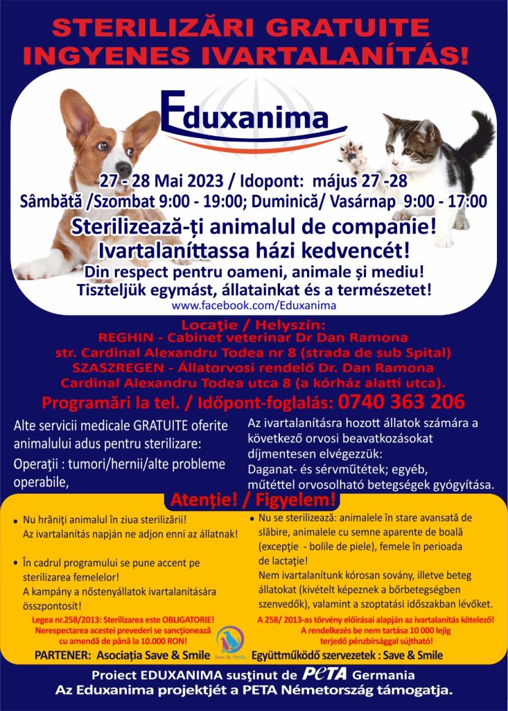 Campanie de sterilizări gratuite 23 mai 2023 Laszlo Crina Lasa un comentariu Campania este destinată cazurilor sociale și animalelor fără stăpân Vizualizari: 480 Stiri sterilizări gratuite