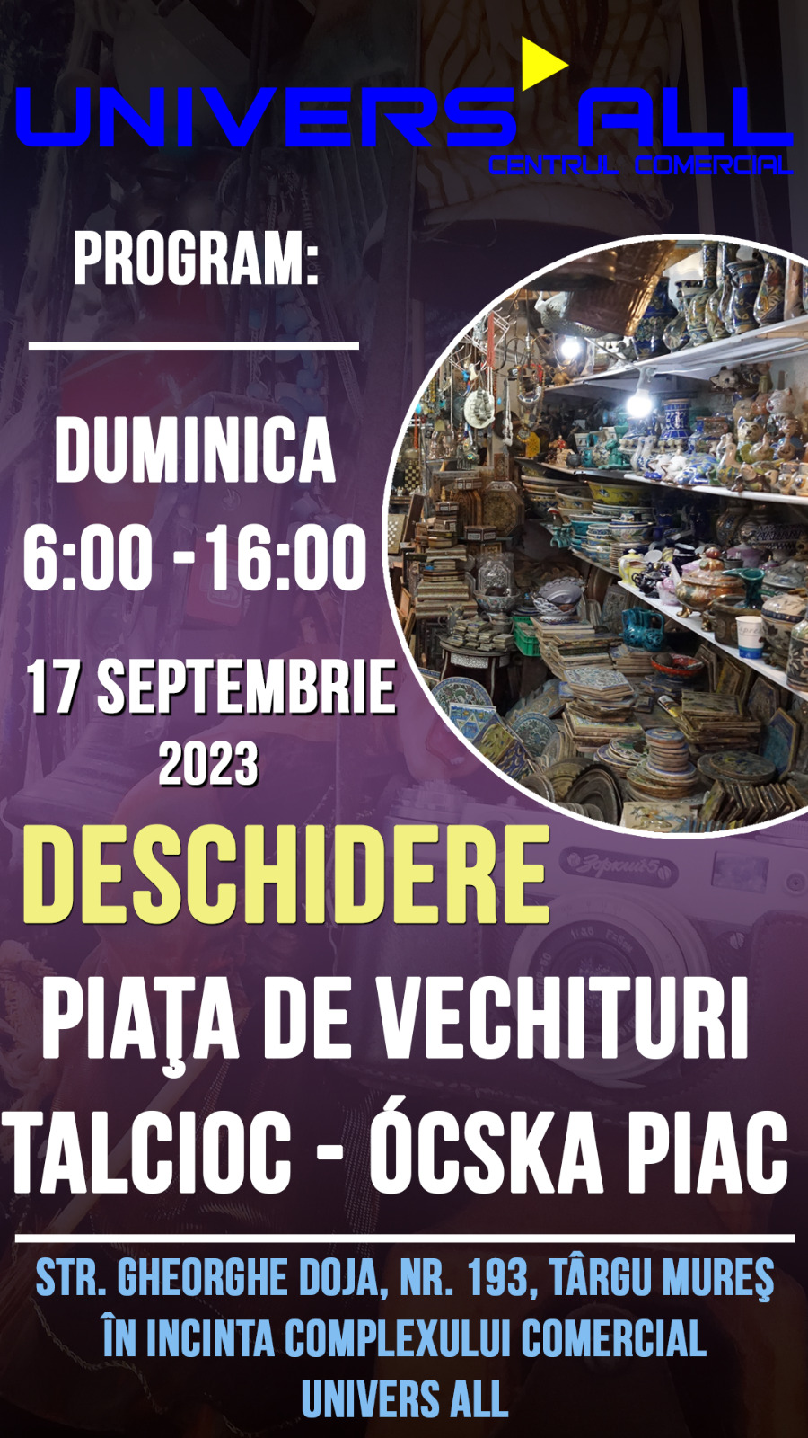 ,,Actuala Piaţă de Vechituri – Ócska Piac îşi va deschide porţile începând cu Duminică – 17 Septembrie 2023 în noua locaţie din incinta Complexului Comercial UniversAll, la adresa sus menţionată, iar Orarul de Funcţionare va fi 6:00 – 16:00 în fiecare zi de Duminică.