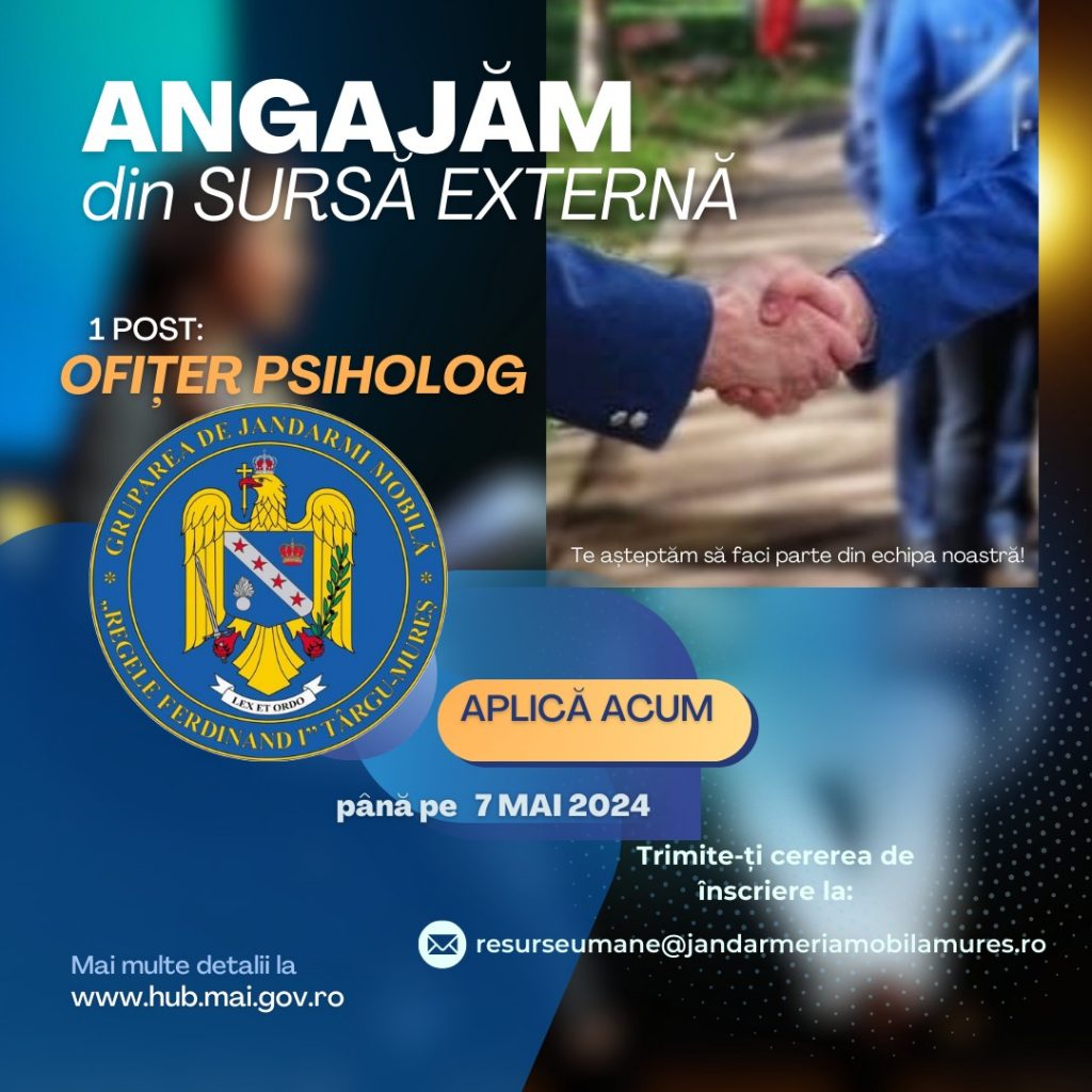 Gruprea de Jandarmi Mobilă Tg Mureș scoate la concurs 1 post de ofițer specialist psiholog, prin încadrare directă, din sursă externă