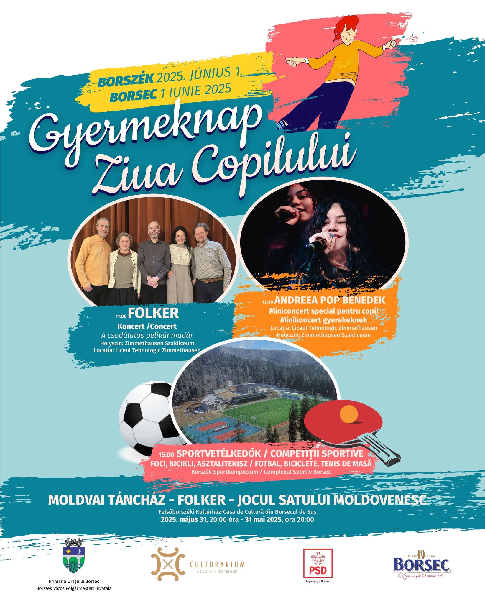 Manifestările continuă duminică, 1 iunie, începând cu ora 11:00, cu un concert interactiv pentru copii în limba maghiară, urmat, de la ora 12:30, de un miniconcert în Sala festivă a Liceului Tehnologic Zimmethausen, care va aduce muzică și veselie în rândul celor mai tineri participanți. Ziua se va încheia activ, de la ora 15:00, la Complexul Sportiv din Borsec, unde copiii vor putea participa la competiții sportive organizate într-un cadru modern și prietenos.