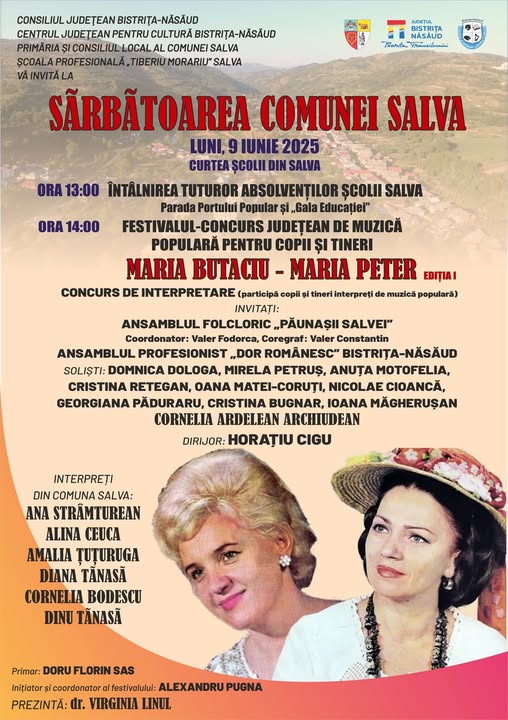 Comuna Salva își deschide porțile pentru un eveniment cu totul special: „Sărbătoarea Comunei Salva”, organizată cu sprijinul Consiliului Județean Bistrița-Năsăud, al Centrului Județean pentru Cultură, Primăriei și Consiliului Local al Comunei Salva, în parteneriat cu Școala Profesională „Tiberiu Morariu”.