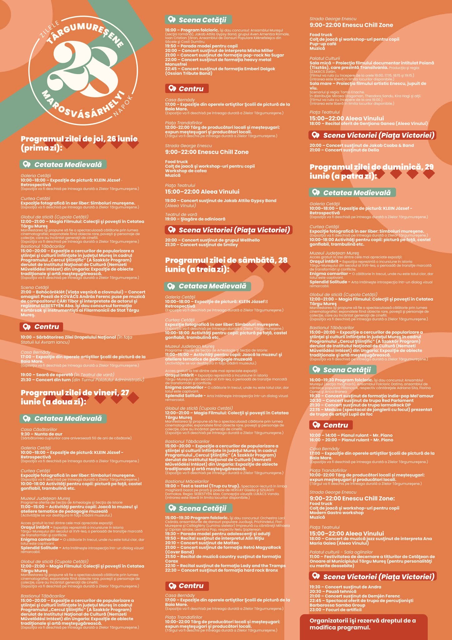 Ediția cu numărul 28 a Zilelor Târgumureșene se desfășoară între 26 – 29 iunie 2025, în mai multe zone din oraș: Cetatea Medievală, Piața Teatrului, Piața Trandafirilor și strada Enescu.
